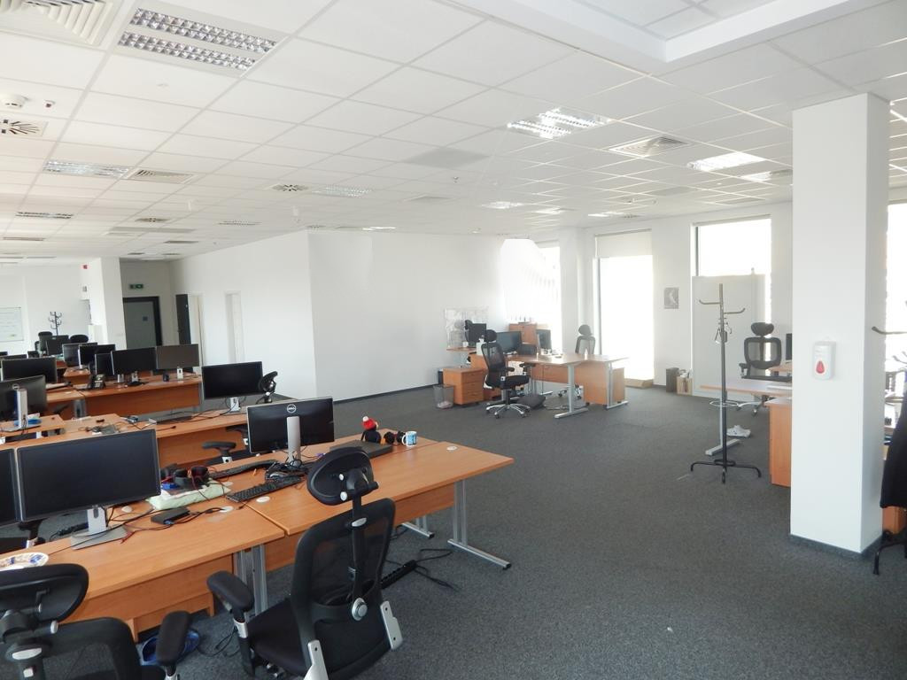 Na podłogach biura wykładzina przemysłowa (pod spodem podniesiona tzw. podłoga techniczna z puszkami podłogowymi), sufity podwieszane z oświetleniem rastrowym.