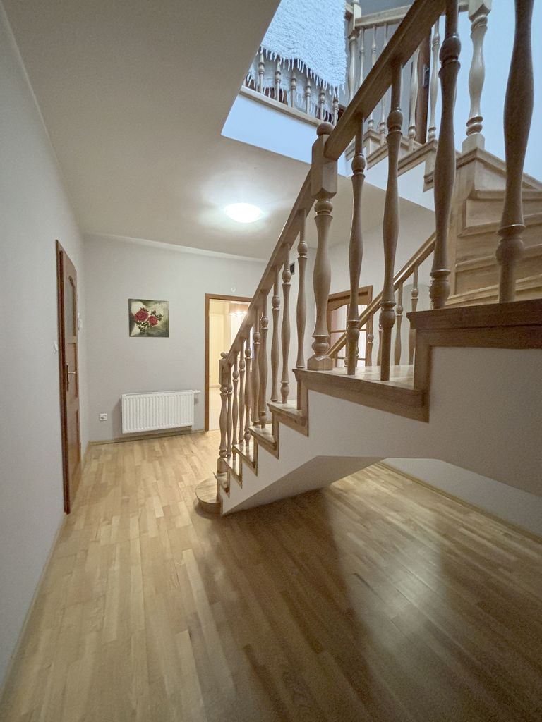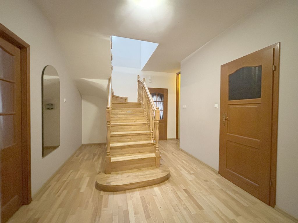 Na podłogach na parterze deska barlinecka i terakota, na podłogach na piętrze panele, ściany gładzone i malowane.