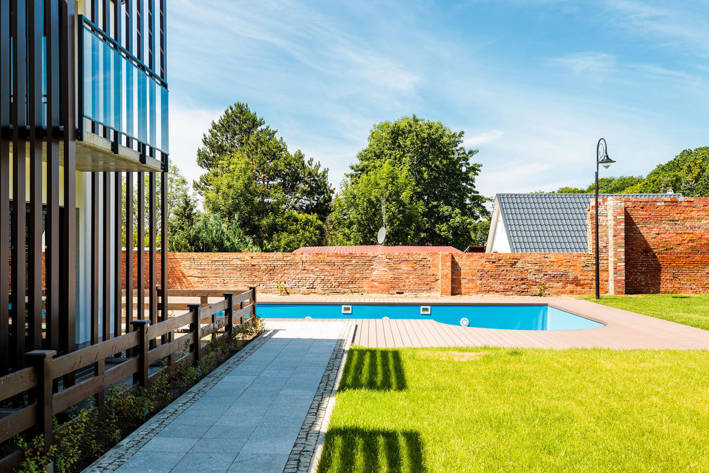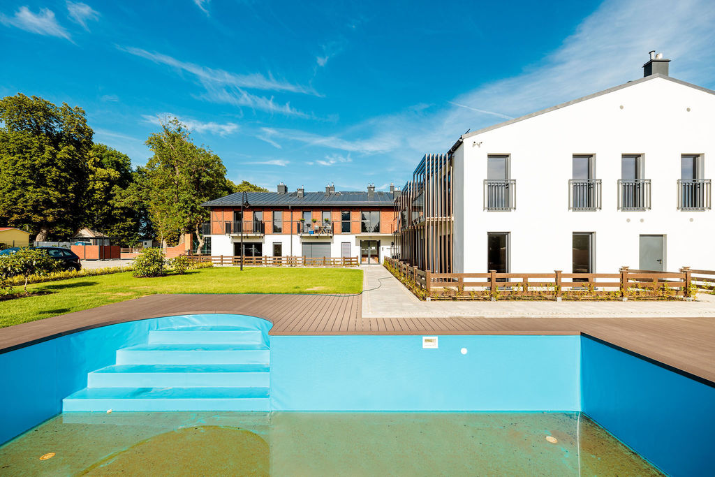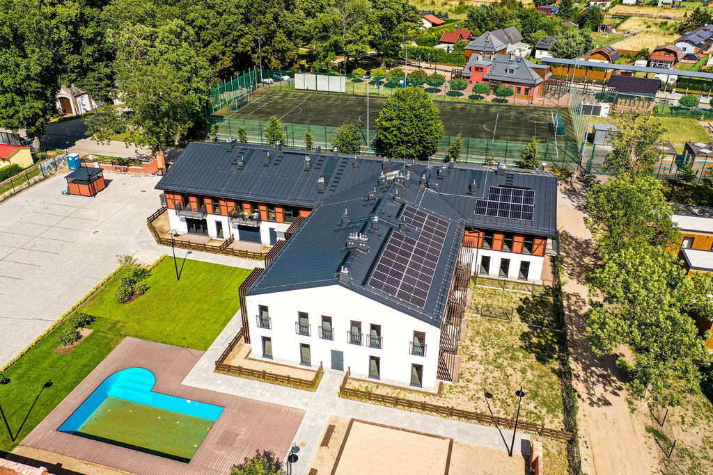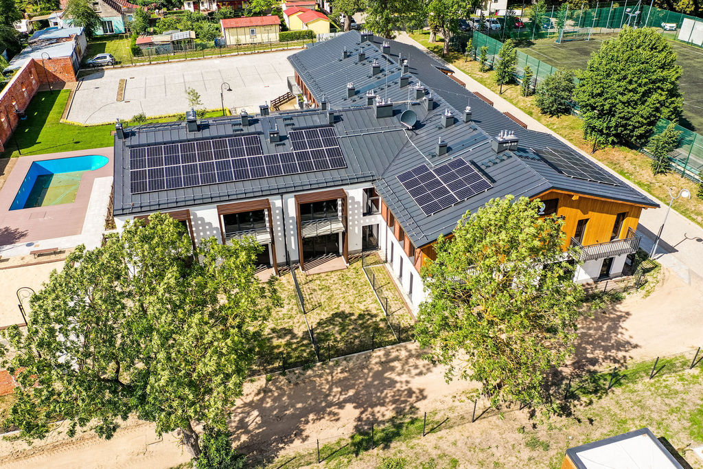Wykorzystanie odnawialnych źródeł energii- panele fotowoltaiczne na dachu oraz basen podgrzewany pompą ciepła.