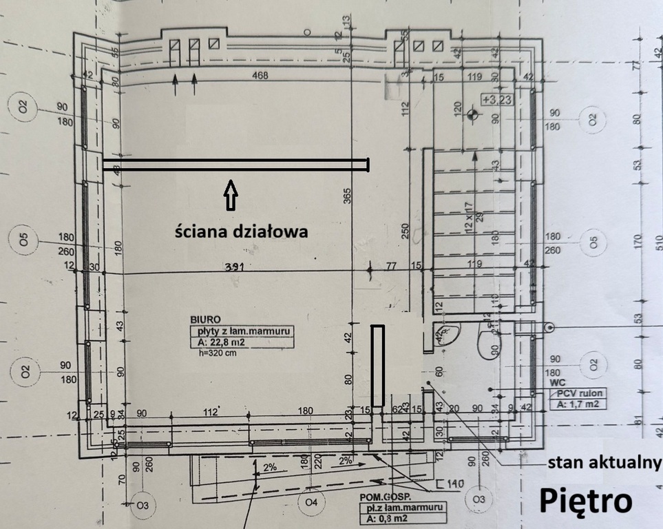 – biuro o pow. 22,8 m2 – aktualnie wydzielone dwa pomieszczenia .