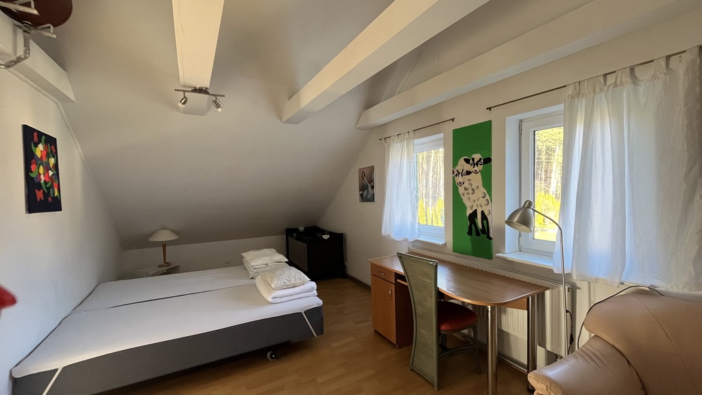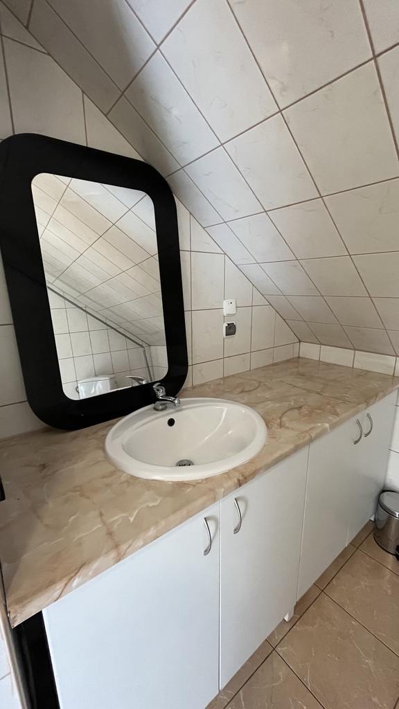 Na piętrze znajdują się dwa pokoje oraz łazienka z kabiną prysznicową.