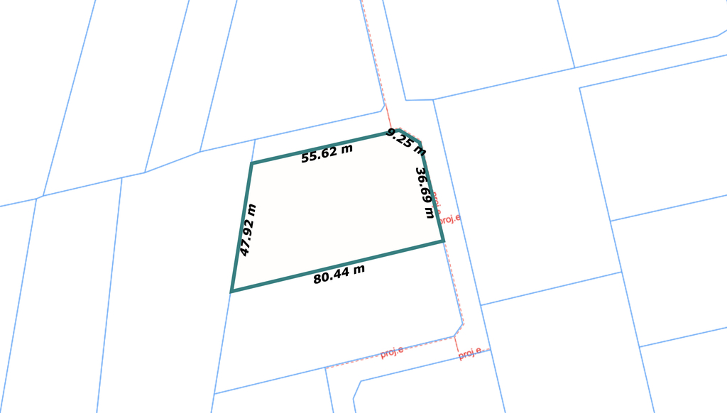 Kształt działki zbliżony do trapezu, wymiary: ok. 56m x 40m.