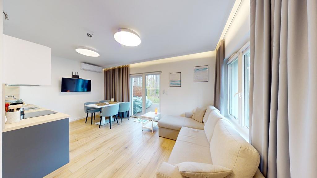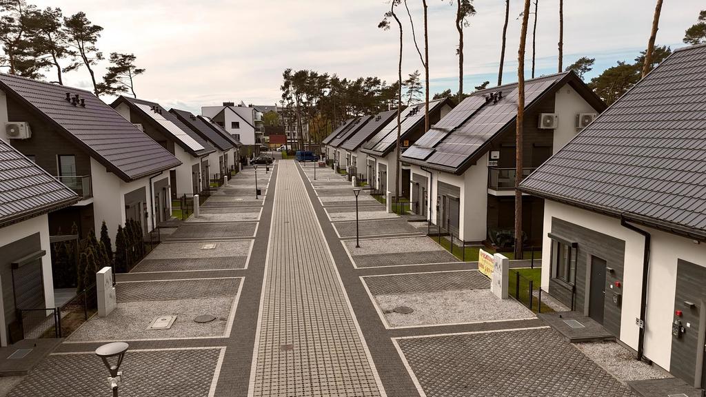 - Design & Komfort: Wnętrza zaprojektowane przez architekta, materiały Marazzi, klimatyzacja sterowana aplikacją, meble ogrodowe na tarasie z modrzewia syberyjskiego.