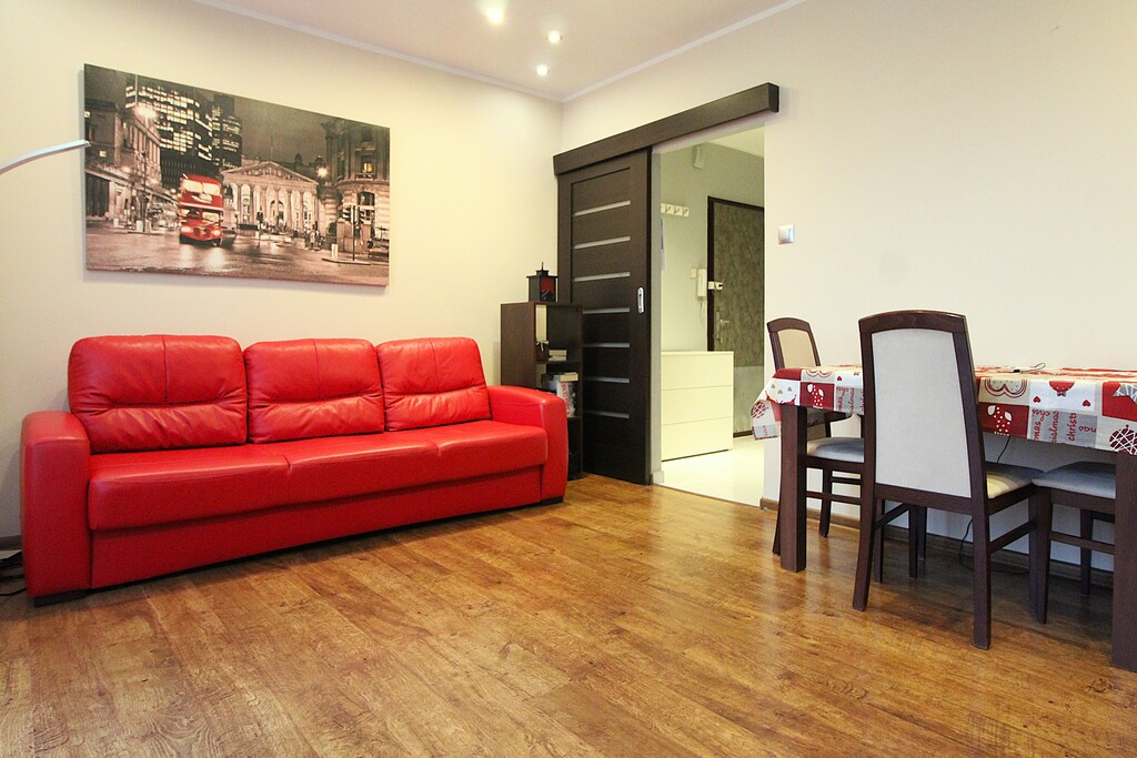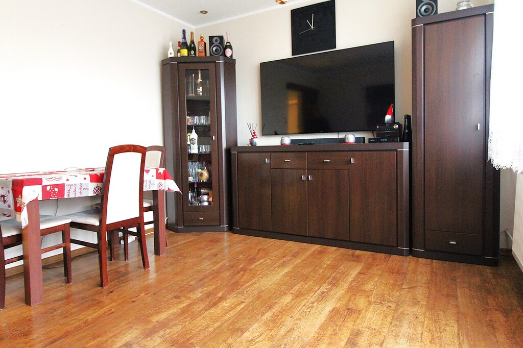 Przy sprzedaży w mieszkaniu pozostaje umeblowana kuchnia, szafy w zabudowie, pozostałe meble do uzgodnienia.