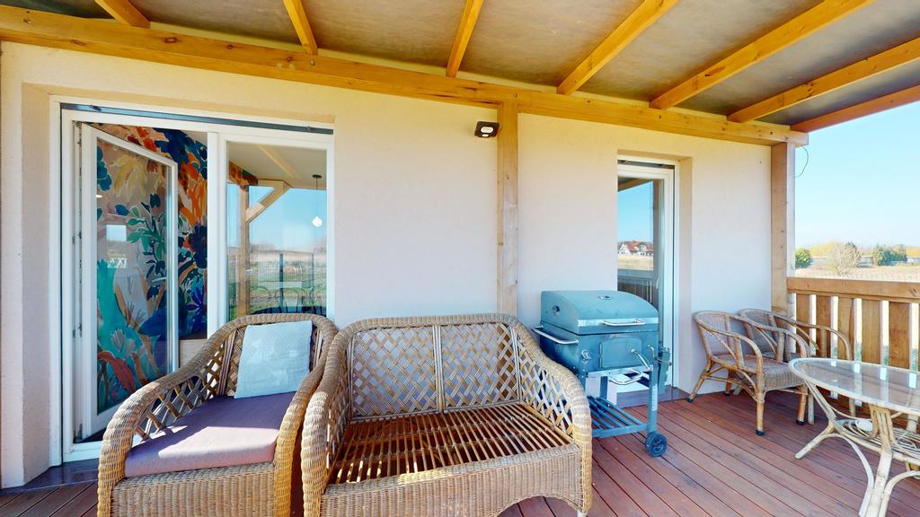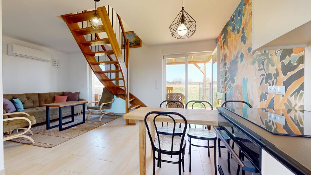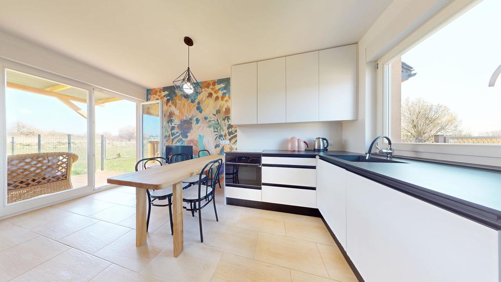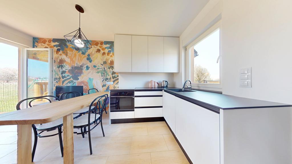 -przestronnego salonu z aneksem kuchennym z wyjściem na słoneczny taras