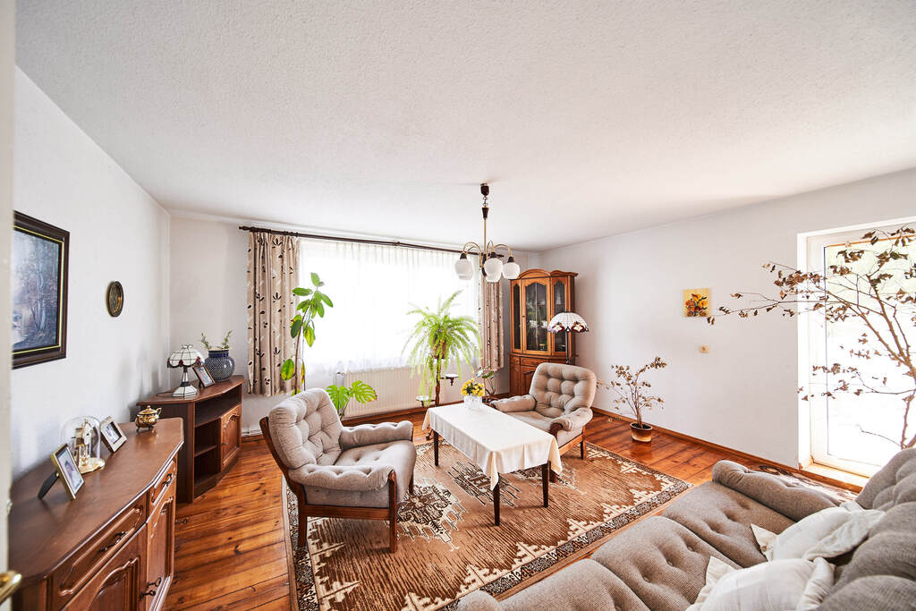 Parter domu stanowi salon ze starymi, przesuwnymi drzwiami, 3 pokoje, kuchnia ze spiżarką, łazienka z oknem i przedpokój.