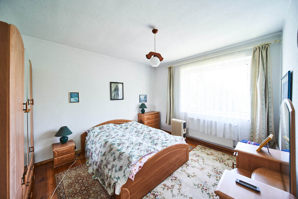 Na I piętrze znajduje się słoneczny salon z wyjściem na taras z pięknym widokiem, 2 duże sypialnie, kuchnia ze spiżarką, łazienka z oknem oraz przedpokój.