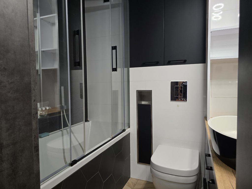 - Łazienka z meblami w zabudowie, wykończona w wysokim standardzie
