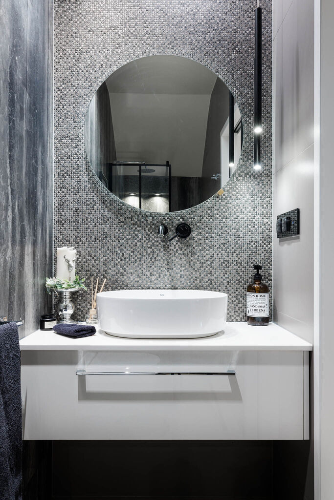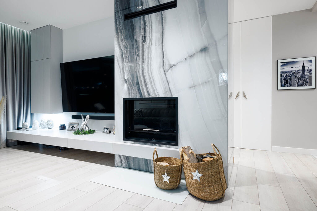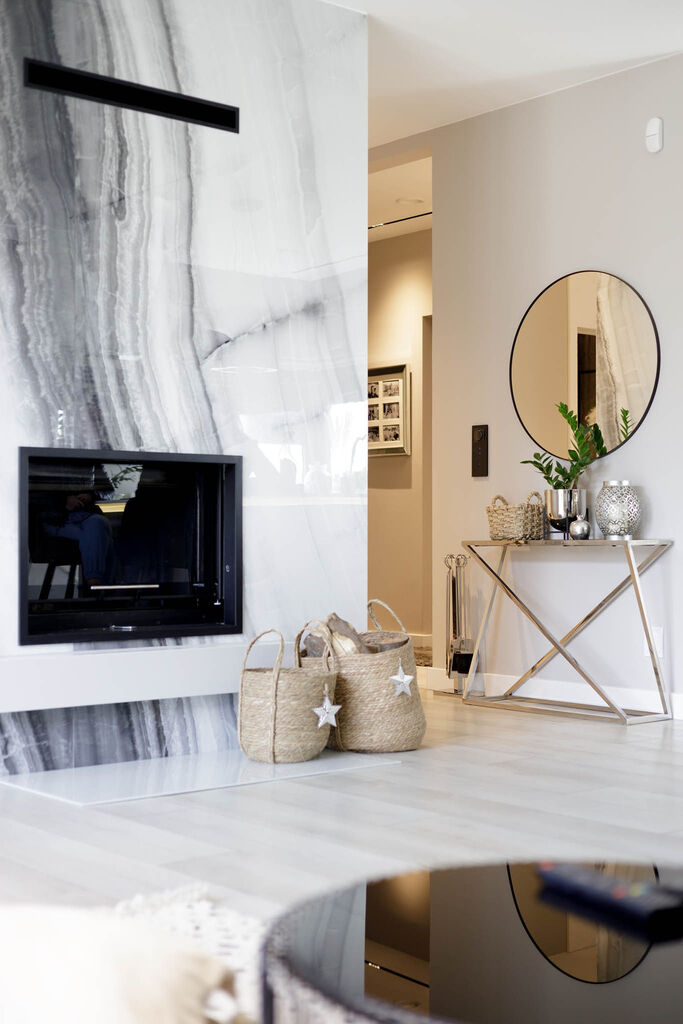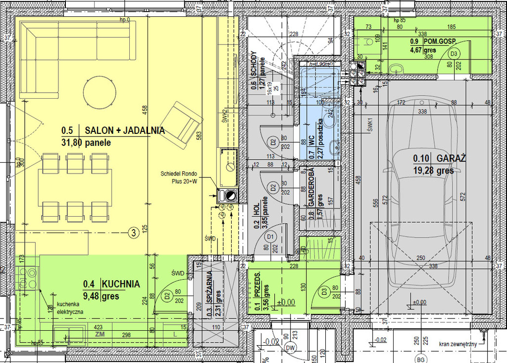 Parter: przestronny salon z kominkiem 31,08m2 z kuchnią 9,48m2, łazienka 2,27m2, garderoba 1,57m2, przedsionek 3,56m2, holl 3,85m2, spiżarnia 2,3m2.