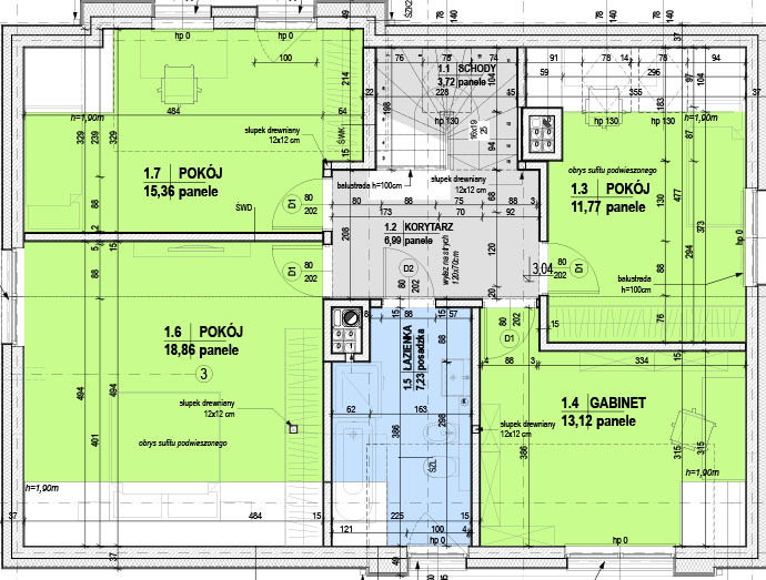 Piętro: 4 pokoje 18,86m2, 15,36m2, 13,12m2, 11,77m2 + łazienka z wc 7,23m2, korytarz 7m2