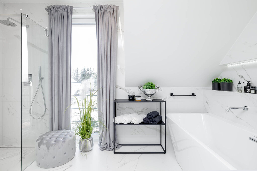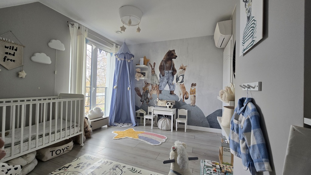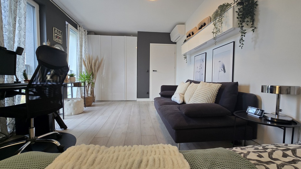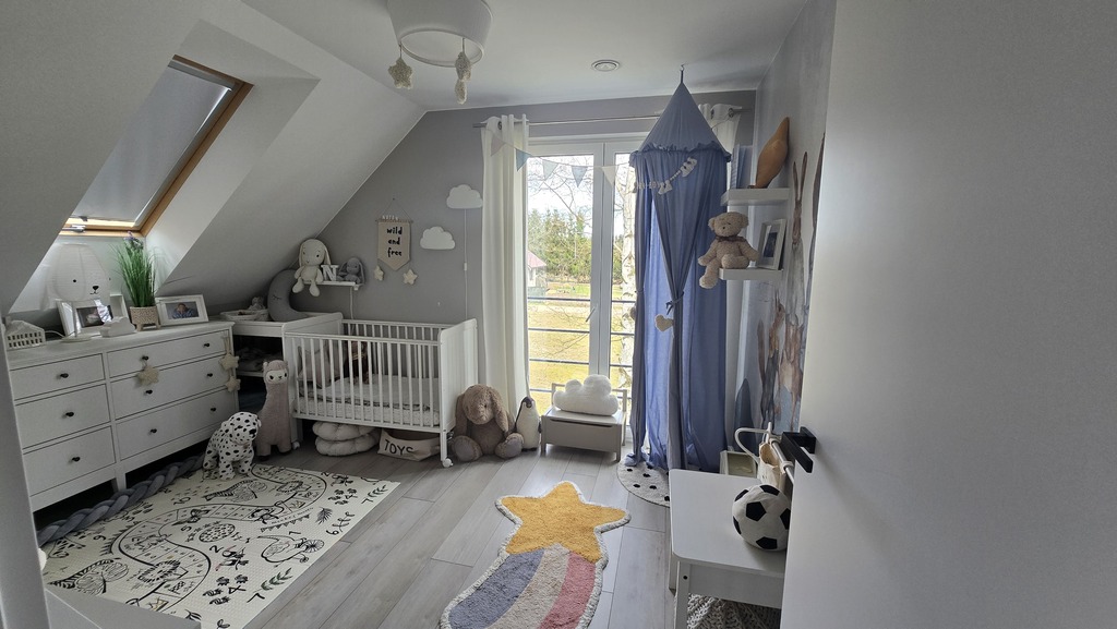 Ocieplony styropianem 20cm grafitowym, okna 3 szybowe z roletami zewnętrznymi + duże okno tarasowe HS,