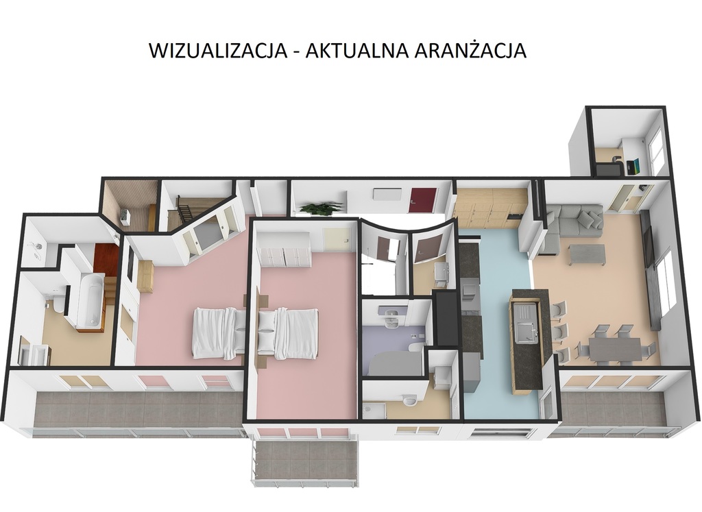 •balkon (12 m2) z wyjściem zarówno z większej sypialni jak i z pokoju kąpielowego.
