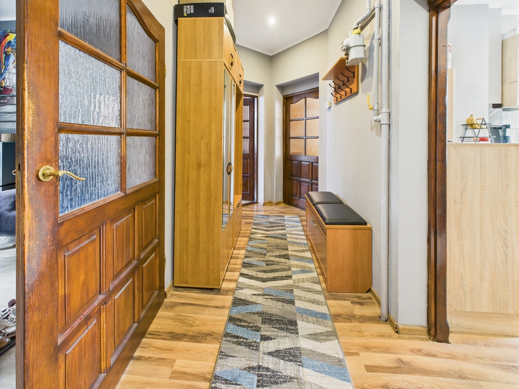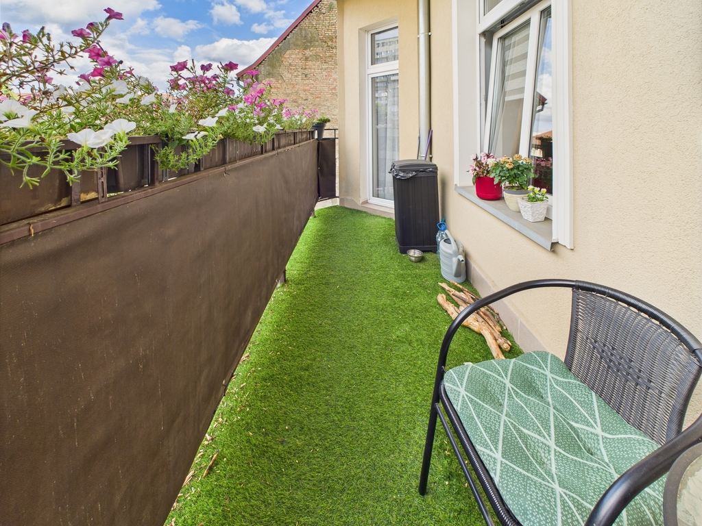 Do mieszkania przynależy balkon z ekspozycją południową – z pięknie ukwieconym parapetem, idealny na poranną kawę. Całość utrzymana jest w spójnym, estetycznym stylu – z dużą dbałością o detale i funkcjonalność. Wnętrza łączą klasyczny charakter kamienicy z nowoczesnym komfortem.