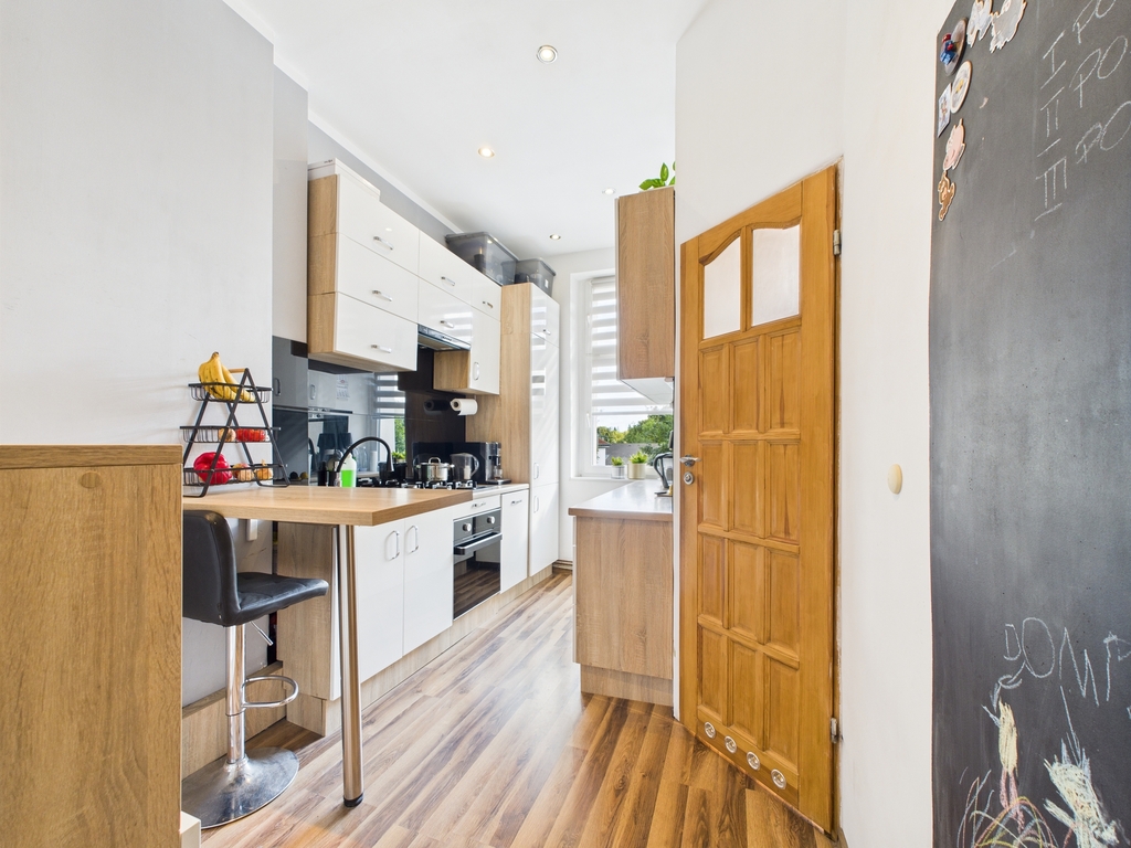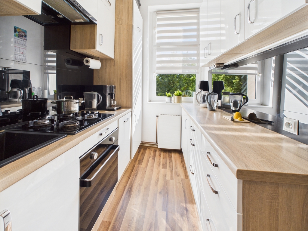 Kuchni (9,4 m²) – nowoczesna, w pełni wyposażona w zabudowę i sprzęt AGD, z widokiem na zieleń za oknem,