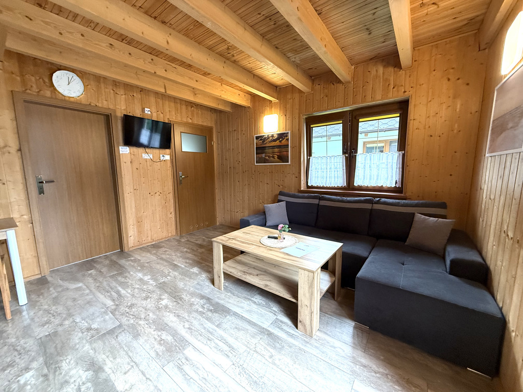 - Salon połączony z aneksem kuchennym – narożnik, telewizor, stolik, stół z krzesłami do posiłków