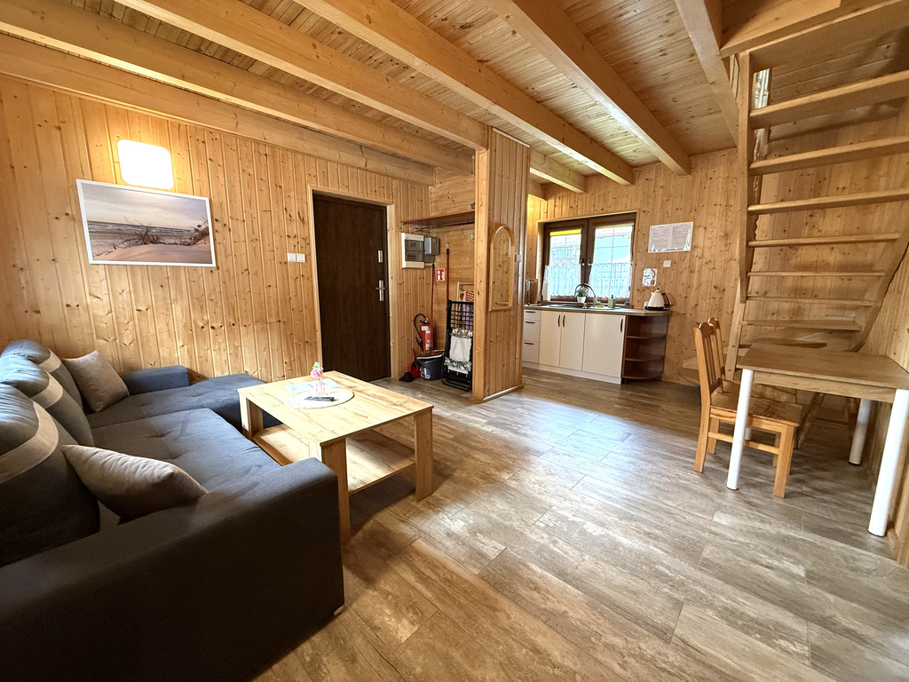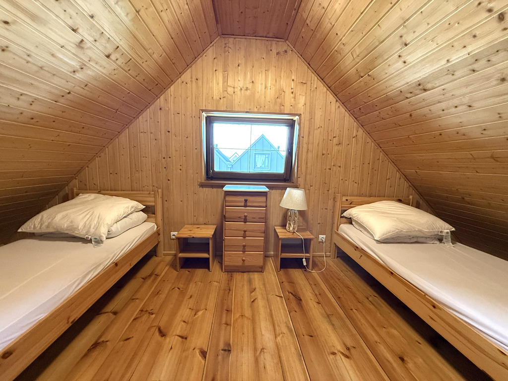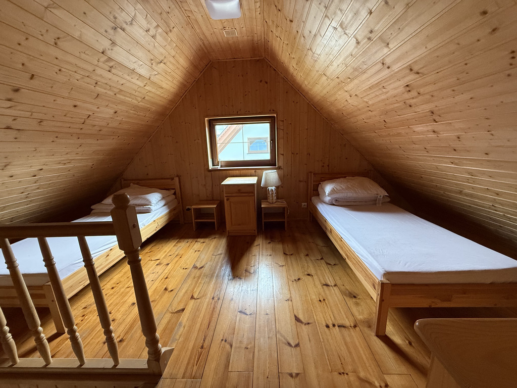 - Piętro: otwarty pokój z dwoma łóżkami + zamknięty pokój z dwoma łóżkami