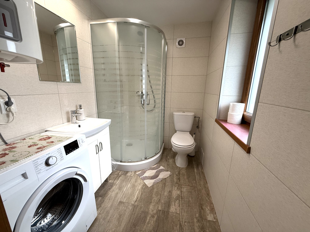 - Łazienka: prysznic, toaleta, umywalka, pralka, bojler elektryczny